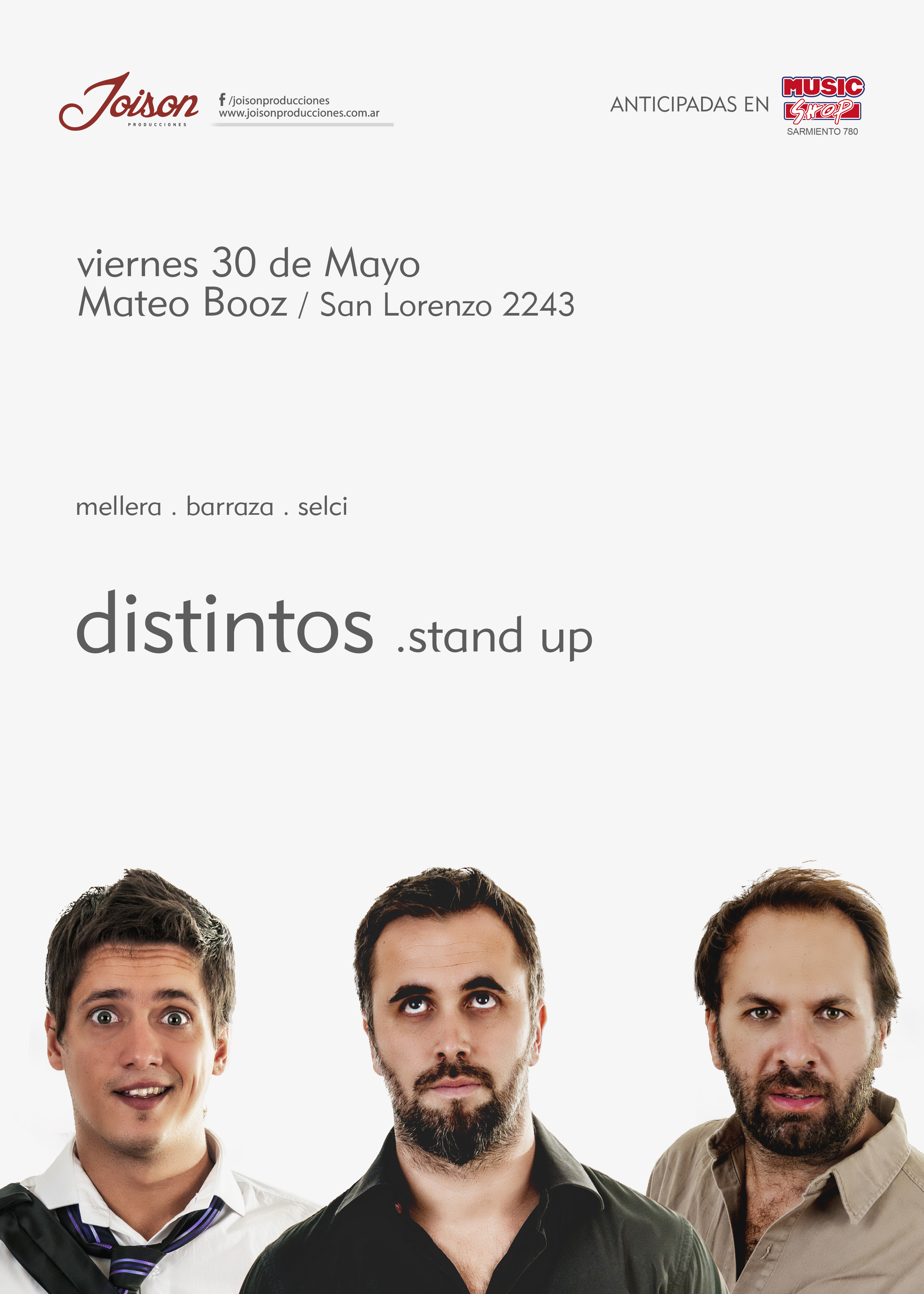 En Distintos, tres comediantes despliegan en sus monólogos un amplio repertorio humorístico, con textos originales creados por ellos mismos. Con estilos y enfoques muy diversos, los tres comediantes mezclan humor, ironía, y parodias para ofrecerles a los espectadores una mirada distinta, auténtica y satírica de observaciones de la vida cotidiana.Links videos: